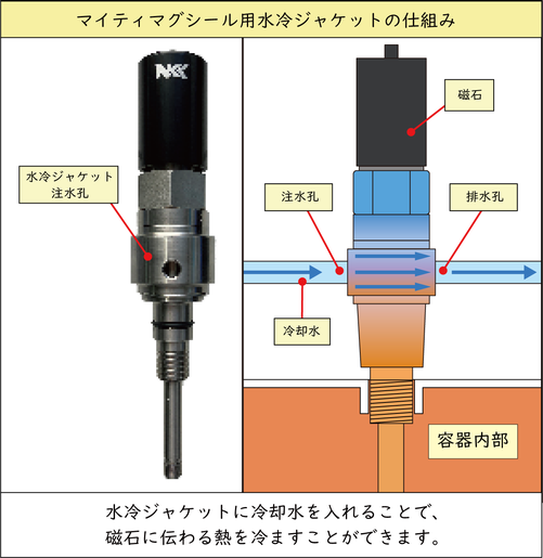 上記写真のマイティマグシールは材質をステンレスに変えたことに加えて、容量20L以上の容器での撹拌を想定し回転トルク2.0Nの磁石を使用しています。さらにオプションとして、中央部に水冷ジャケットを設けています。