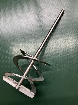 しかし、上記写真のような撹拌翼(パドル翼)は高負荷・高粘度の撹拌にはちょっと不向き。そんなときも金属製撹拌棒の場合、樹脂では加工が難しい高負荷に耐えられる撹拌翼も作ることができます。
