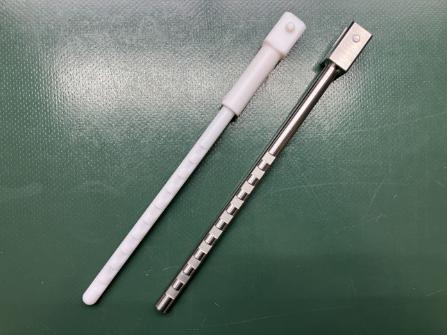 もちろん、各種取付寸法はPTFE撹拌棒と同じなので、撹拌翼などはPTFE撹拌棒と同じものを使うことができます。