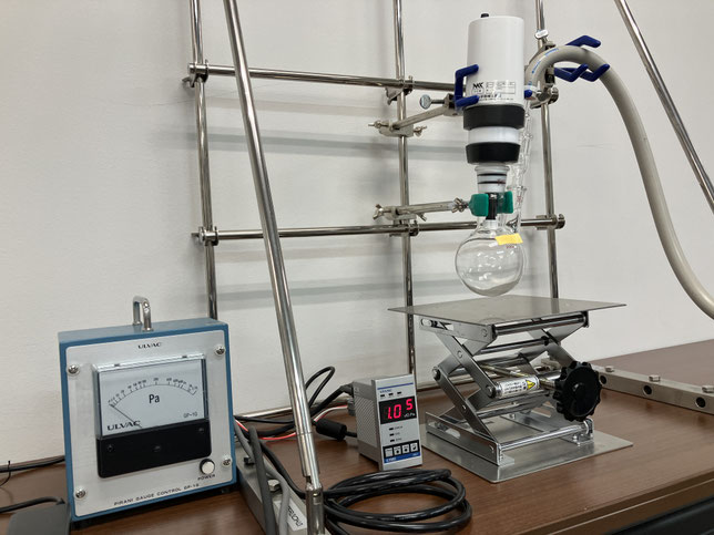 ①UZUを取り付けた丸形フラスコの内部気圧を、真空ポンプ※を使って下げる。